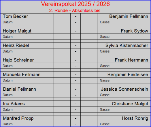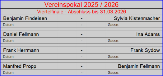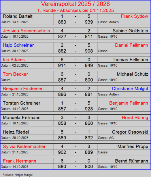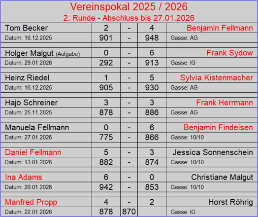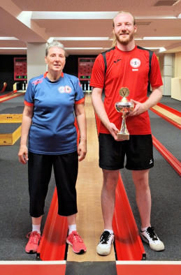 Der Vereinspokal 2024 / 2025 ist vegeben und hat einen eindeutigen Sieger gefunden, Benjamin Fellmann. Er wurde seiner Favoritenrolle gerecht. Benny konnte seinen Titel aus den letzten beiden Jahren erfolgreich gegen seine diesjährige Herausforderin Sylvia Kistenmacher erfolgreich verteidigen. Er konnte sein Superergebnis aus dem Halbfinale wiederholen. auch Sylvia spielte mit 906 Holz ein gutes Ergebnis und war eine würdige Finalteilnehmerin.Benny ist der erste Kegler, der dreimal den Pokal gewann und das noch nacheinander. Derzeit überragt er auf unserer Kegelsportanlage alle. Es bedarf schon einen außergewöhnlichen Tag, um ihn hier in Verlegenheit zu bringen. Herzlichen Glückwunsch an Benny zur Verteidigung des Vereinspokals!!