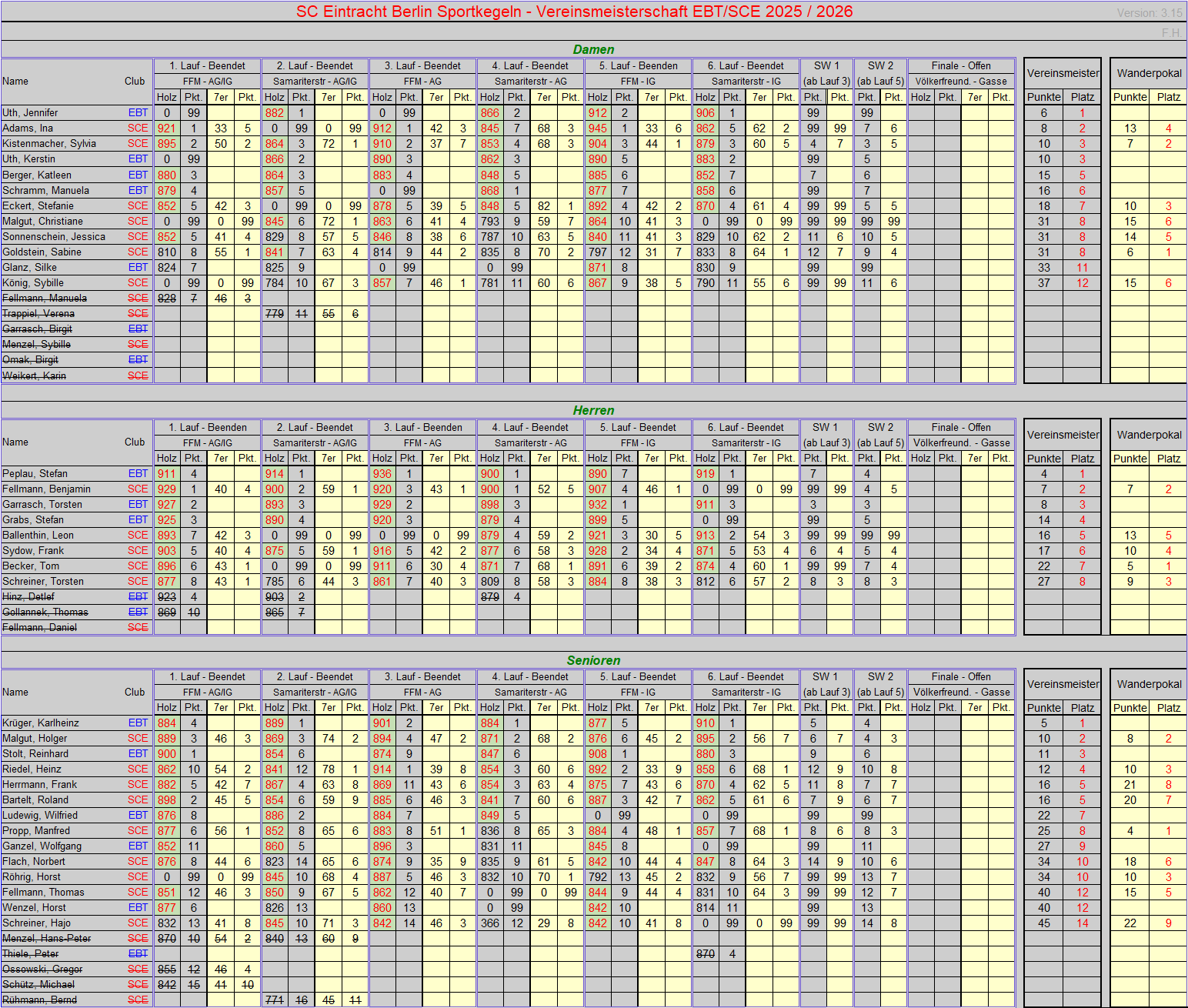 Abschluß der Vorrundeen zur internen Meisterschaft unserer Spielgemeinschaft. Sechs Läufe sind absolviert, von denen die besten sich die besten vier in der Wertung wiederfinden. Am 30. Mai startet das große Finale in der "Völkerfreundschaft“. Dort werden unsere Vereinsmeister gekürt.
