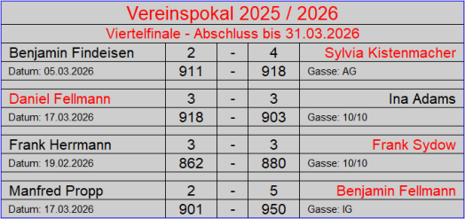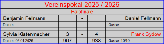 Der Vereinspokal 2024 / 2025 ist vegeben und hat einen eindeutigen Sieger gefunden, Benjamin Fellmann. Er wurde seiner Favoritenrolle gerecht. Benny konnte seinen Titel aus den letzten beiden Jahren erfolgreich gegen seine diesjährige Herausforderin Sylvia Kistenmacher erfolgreich verteidigen. Er konnte sein Superergebnis aus dem Halbfinale wiederholen. auch Sylvia spielte mit 906 Holz ein gutes Ergebnis und war eine würdige Finalteilnehmerin.Benny ist der erste Kegler, der dreimal den Pokal gewann und das noch nacheinander. Derzeit überragt er auf unserer Kegelsportanlage alle. Es bedarf schon einen außergewöhnlichen Tag, um ihn hier in Verlegenheit zu bringen. Herzlichen Glückwunsch an Benny zur Verteidigung des Vereinspokals!!